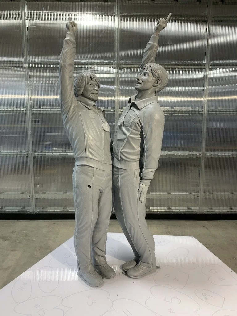 The 20 life-sized bronze figures with gold patina will be mounted to a granite replica of the awards podium. The silver and bronze granite podiums will also flank the monument making an ideal tourist/fan photo opportunity. The monument is intended to be located at the front of the entrance of the 1980 Herb Brooks Arena in Lake Placid, NY.